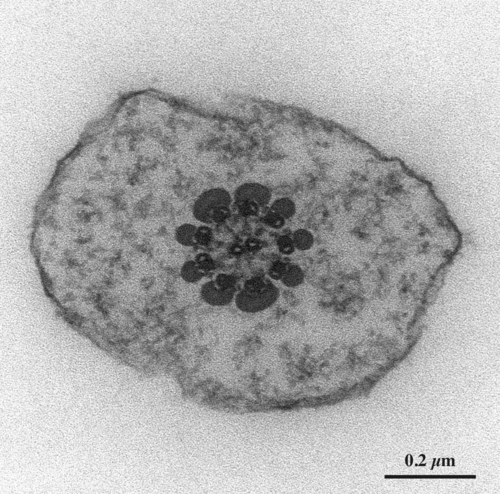 2本の中心細管を取り囲む9本の周辺細管が糸状の軸糸で