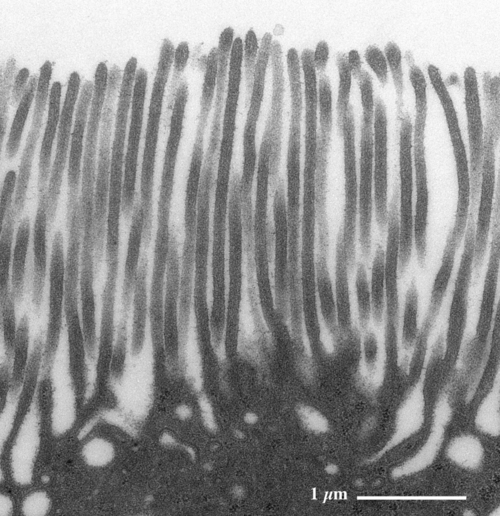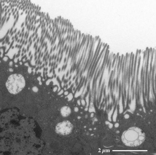上皮細胞の頂上部に微絨毛が並んで表面積を増大しています。