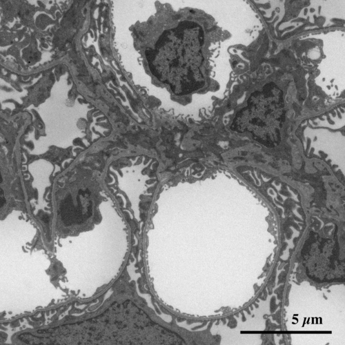 円形の毛細血管を足細胞が取り囲む構造が観察されます。