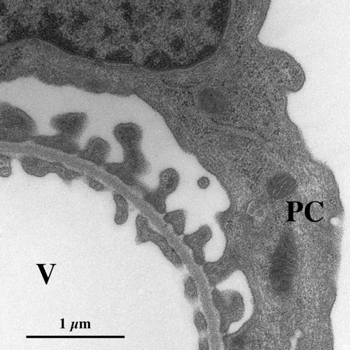 足細胞(PC)の突起が毛細血管(V)の外周を取り囲む様子が観察されます。
