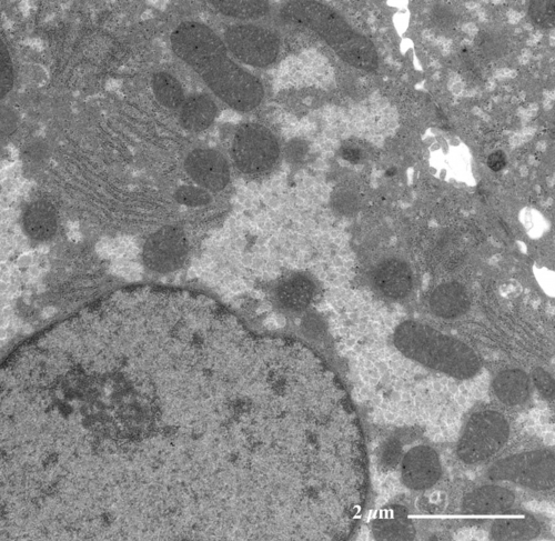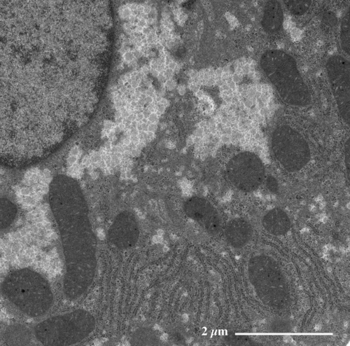 肝細胞内部の発達した粗面小胞体とグリコーゲン顆粒(白い部分)