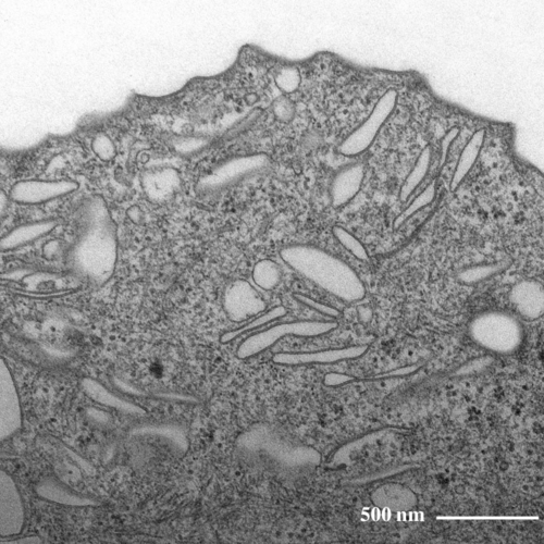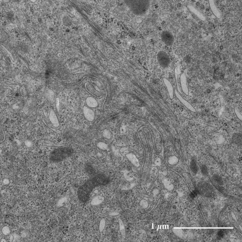 特徴的な紡錘形の小胞が多数、観察されます
