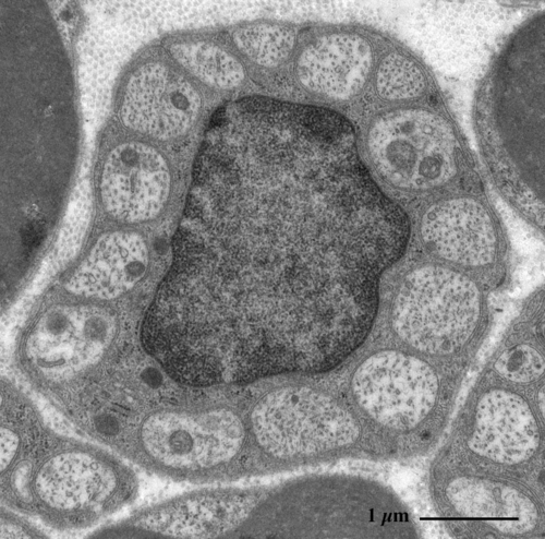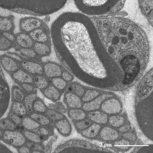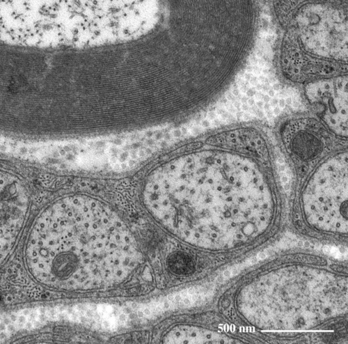 有髄神経(右上)と無髄神経(左下)の電子顕微鏡像