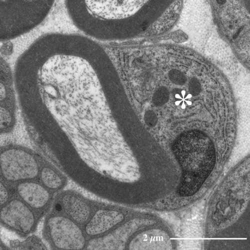 有髄神経の髄鞘を取り巻くシュワン細胞(*)
