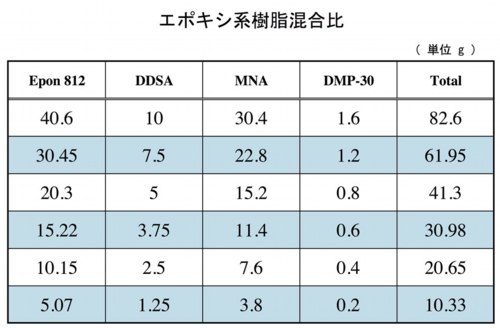 エポキシ系樹脂はEpon812、DDSA、MNAと加速剤のDMP-30の4剤を混合して調製します。