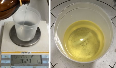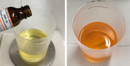 3分ほど攪拌した後、DMP-30を追加して計り入れ、再び攪拌します。DMP-30が混ざると色調が濃く変化しますので、ムラが生じないよう5分程度かけて十分に攪拌します。