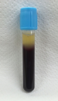真空採血管に入った全血を 200 g で5分間、スイングローターで遠心分離すると、赤血球が沈殿し、黄色い血漿が上清として分離されます。