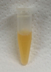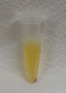 先の細いスポイトで赤血球が混入しないよう慎重に血漿を採取し、1.5 mlのエッペンドルフチューブに入れます。