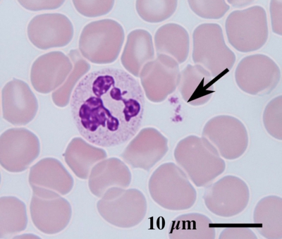 血小板(矢印)の直径は僅か1〜2 µmしかなく、光学顕微鏡では点状に観察されるのみです。