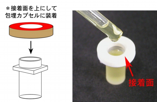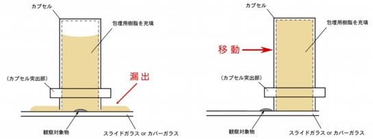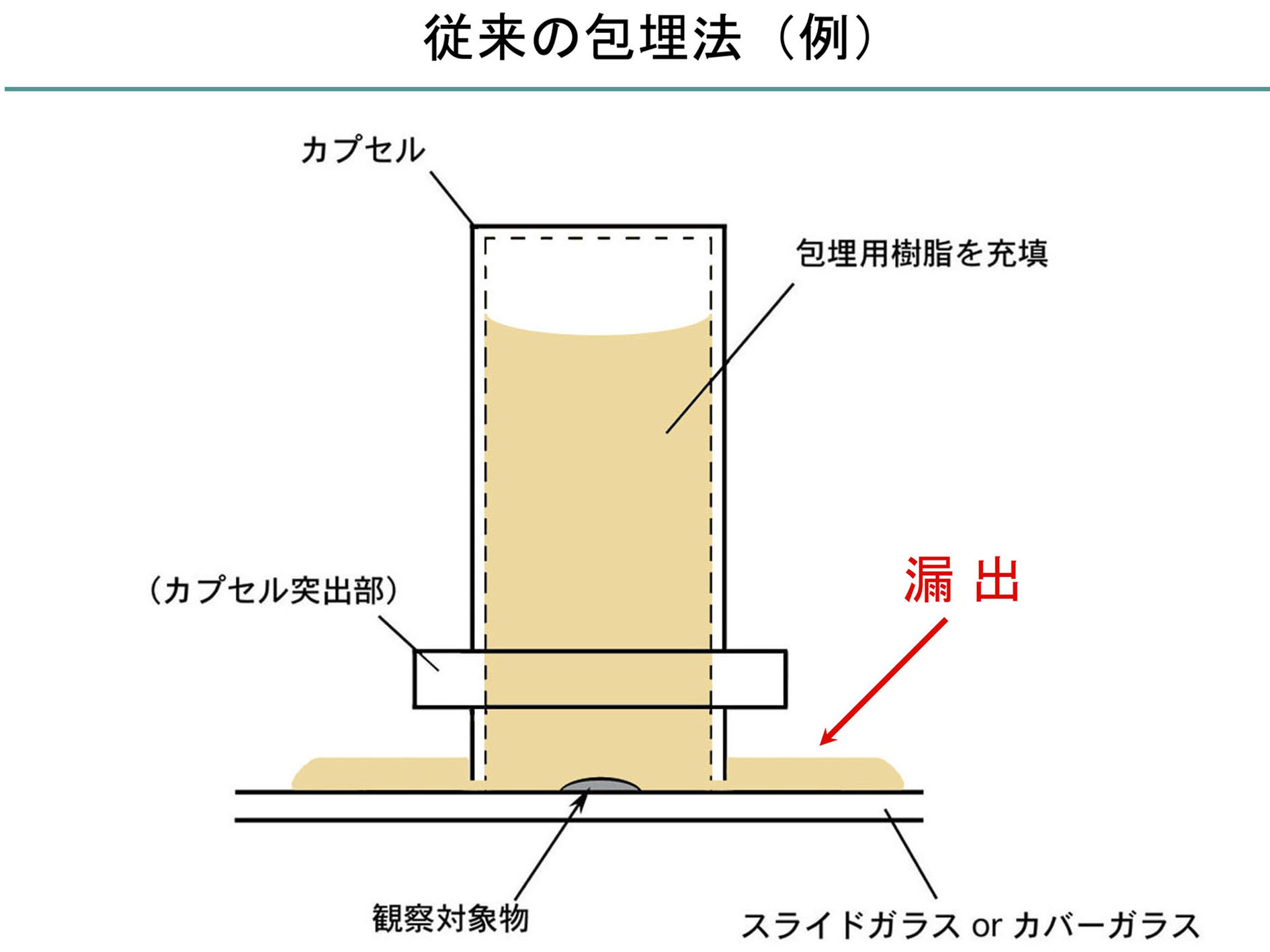 十分に脱水処理を加えた後、樹脂に包埋しますが、従来、包埋する際に樹脂包埋カプセルとカバーガラスの間から重合・硬化前の樹脂が漏出してしまったり、樹脂包埋カプセルが移動してカバーガラスから外れて硬化してしまうトラブル発生が少なくありませんでした。