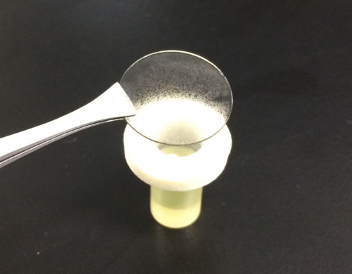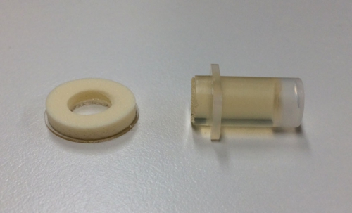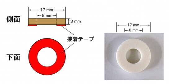 これは片面に接着シールが貼付されたスポンジ状のリングで、孔の内径と樹脂包埋カプセルの外径が丁度、8 mmでピッタリはまりますので、予め樹脂包埋カプセルに装着したところへ樹脂を流し込みます。