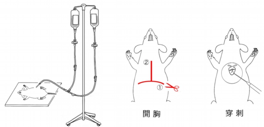 灌流固定はマウスやラットなどの小動物に麻酔をかけた状態で、心臓の左心室から固定液を注入するもので、手技に一定の熟練を要しますが、細胞や組織が生きた状態で固定液が末梢血管に行き渡ることから、良好な固定条件を得ることができます。