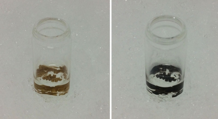 バイアルに入った1gの結晶を50 mlの蒸留水に溶かし、2%水溶液として冷蔵保存します。四酸化オスミウムのガスは皮膚や呼吸器を傷害するため、手袋やマスクを着用の上、ドラフトチャンバー内で取り扱います。