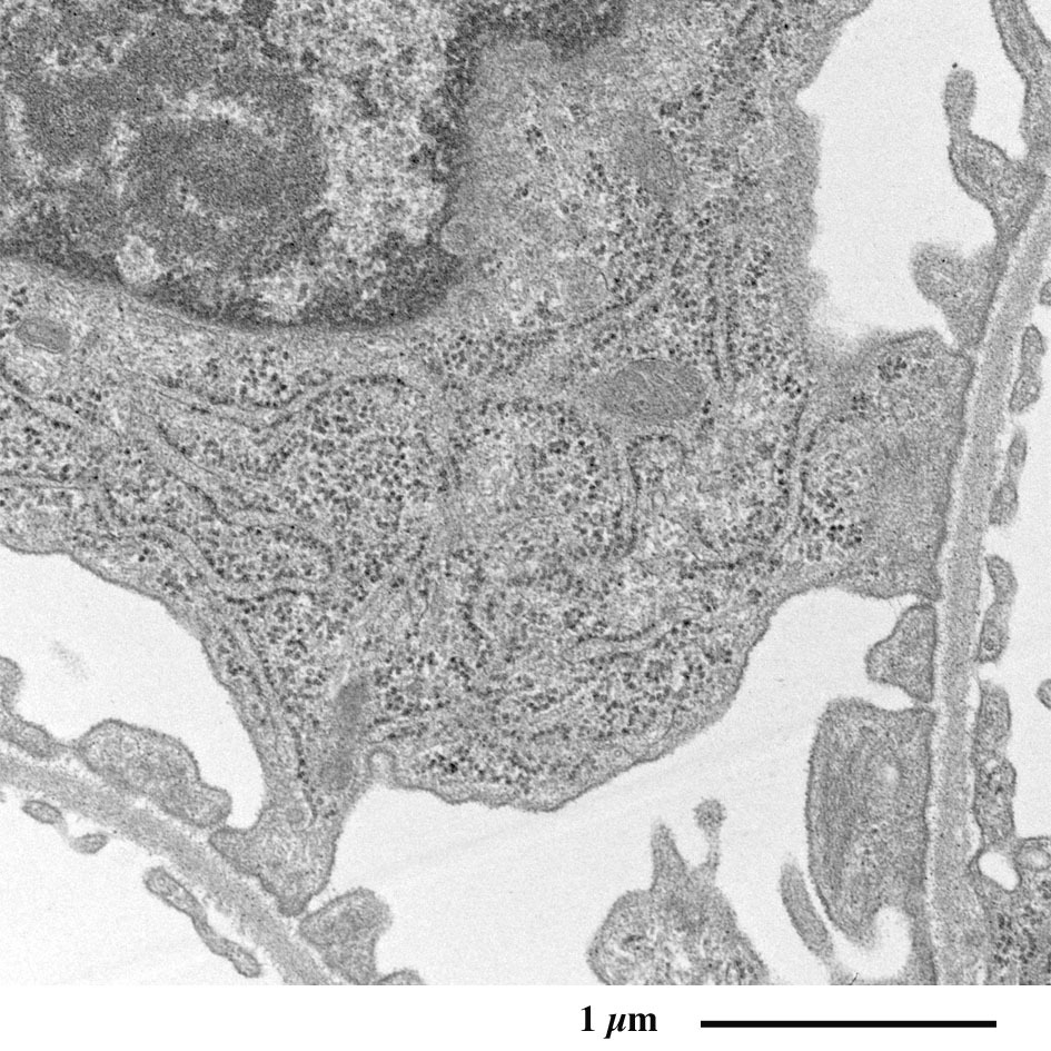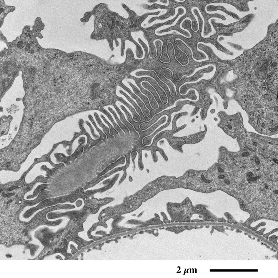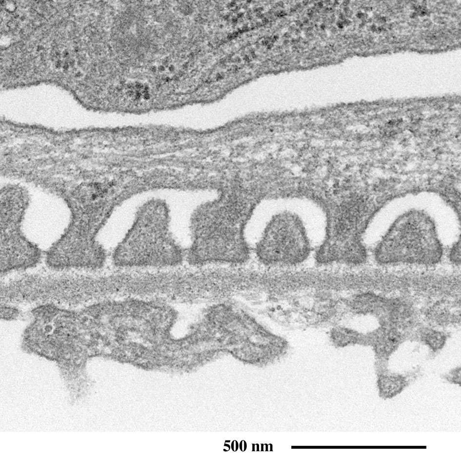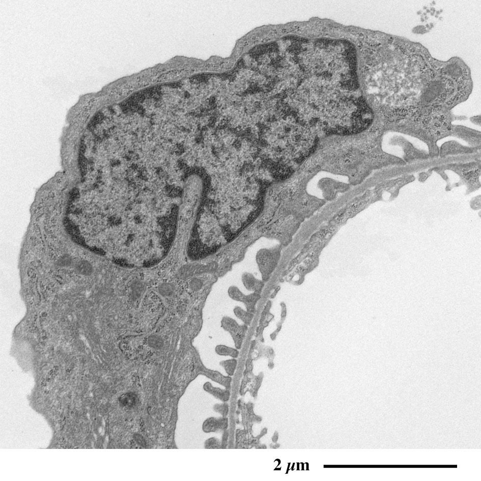 毛細血管の外周を取り囲む足細胞の足突起が観察されます。