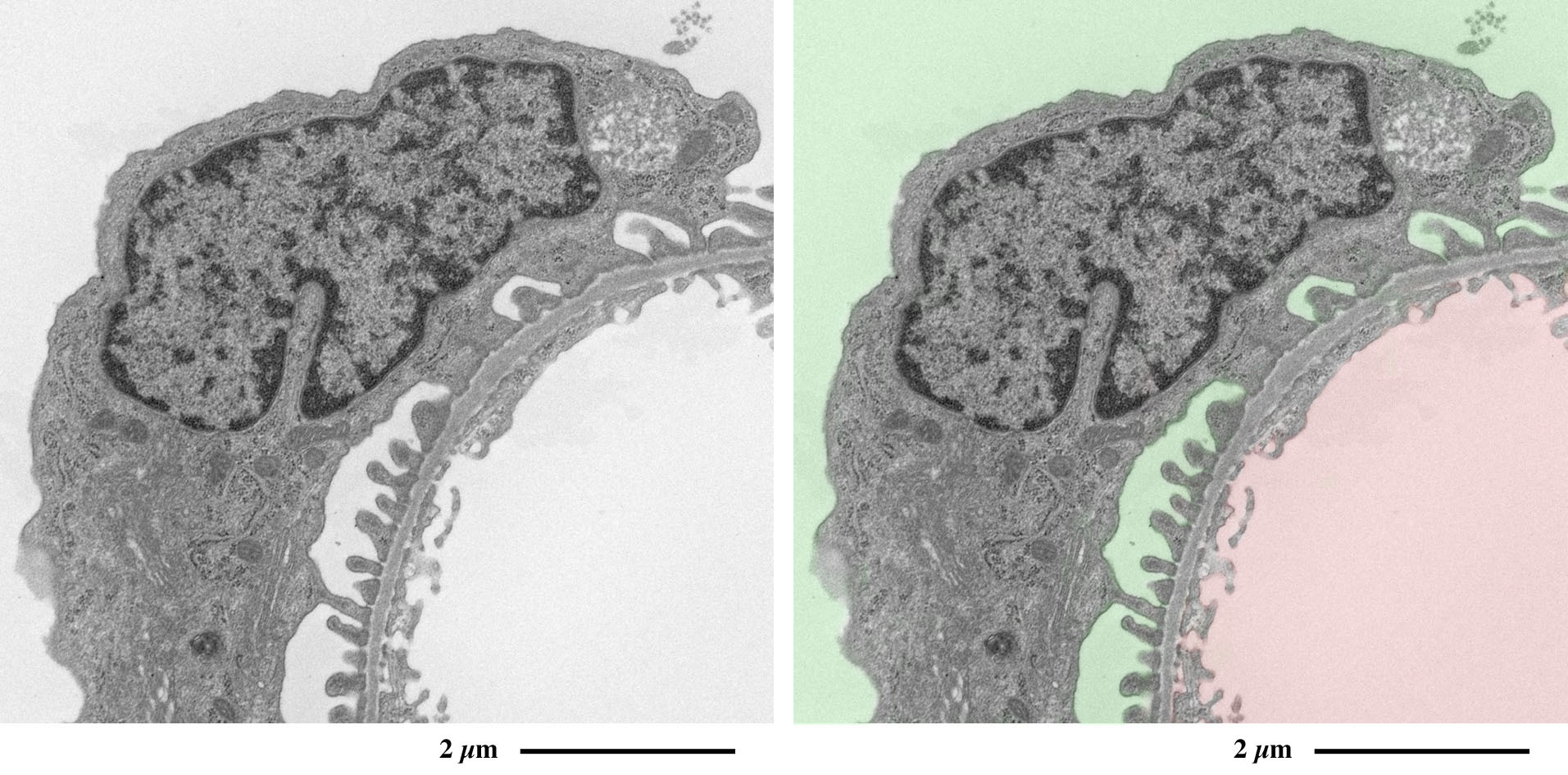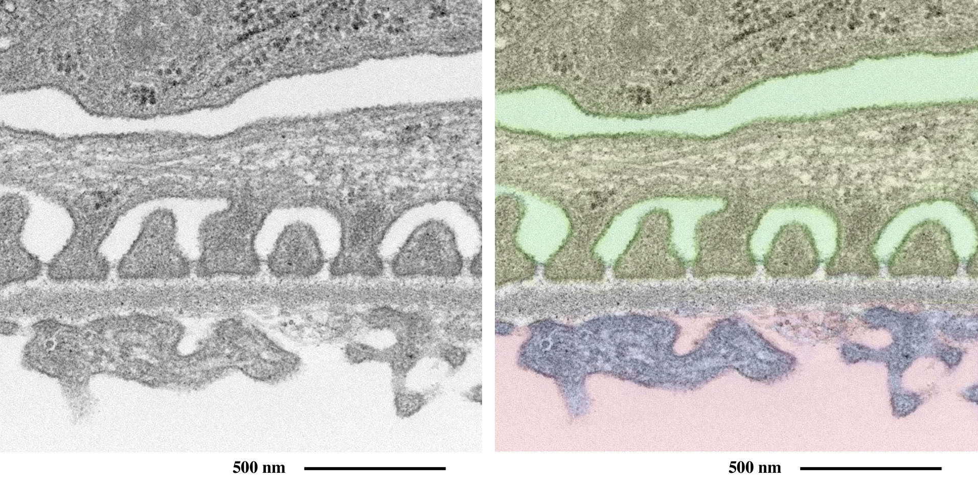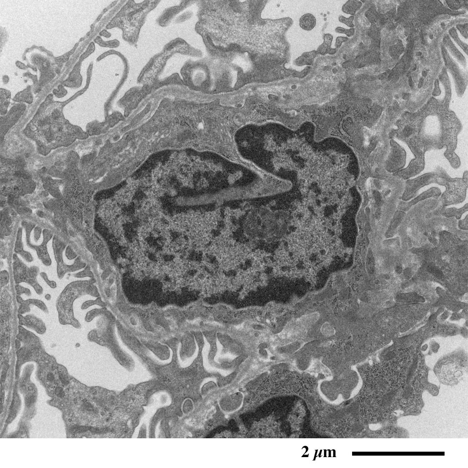 毛細血管の外周を取り囲む足細胞の足突起が観察されます。