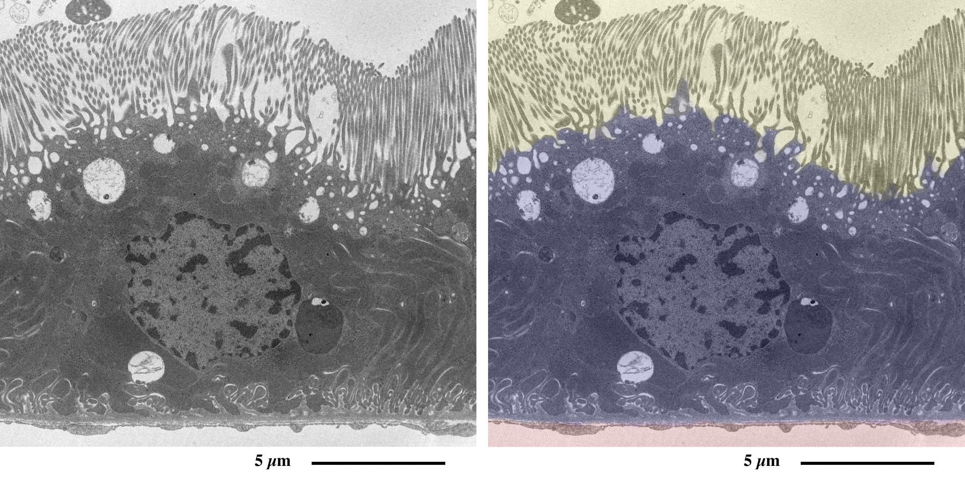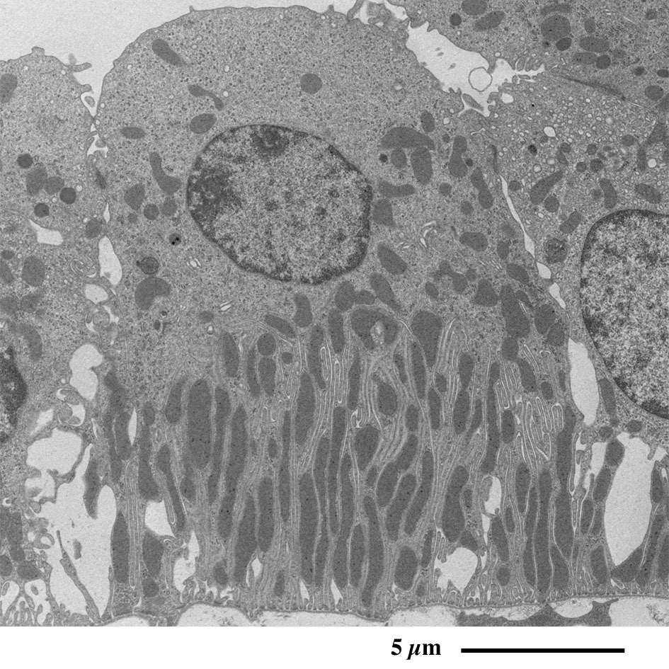 上皮細胞の頂上部に微絨毛が並んで表面積を増大しています。