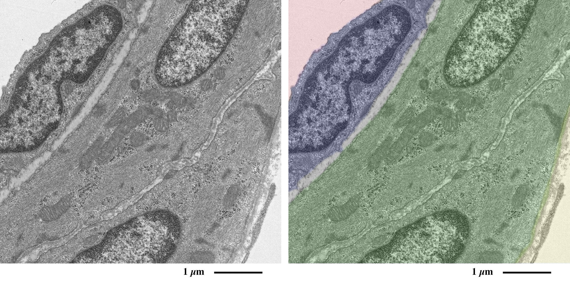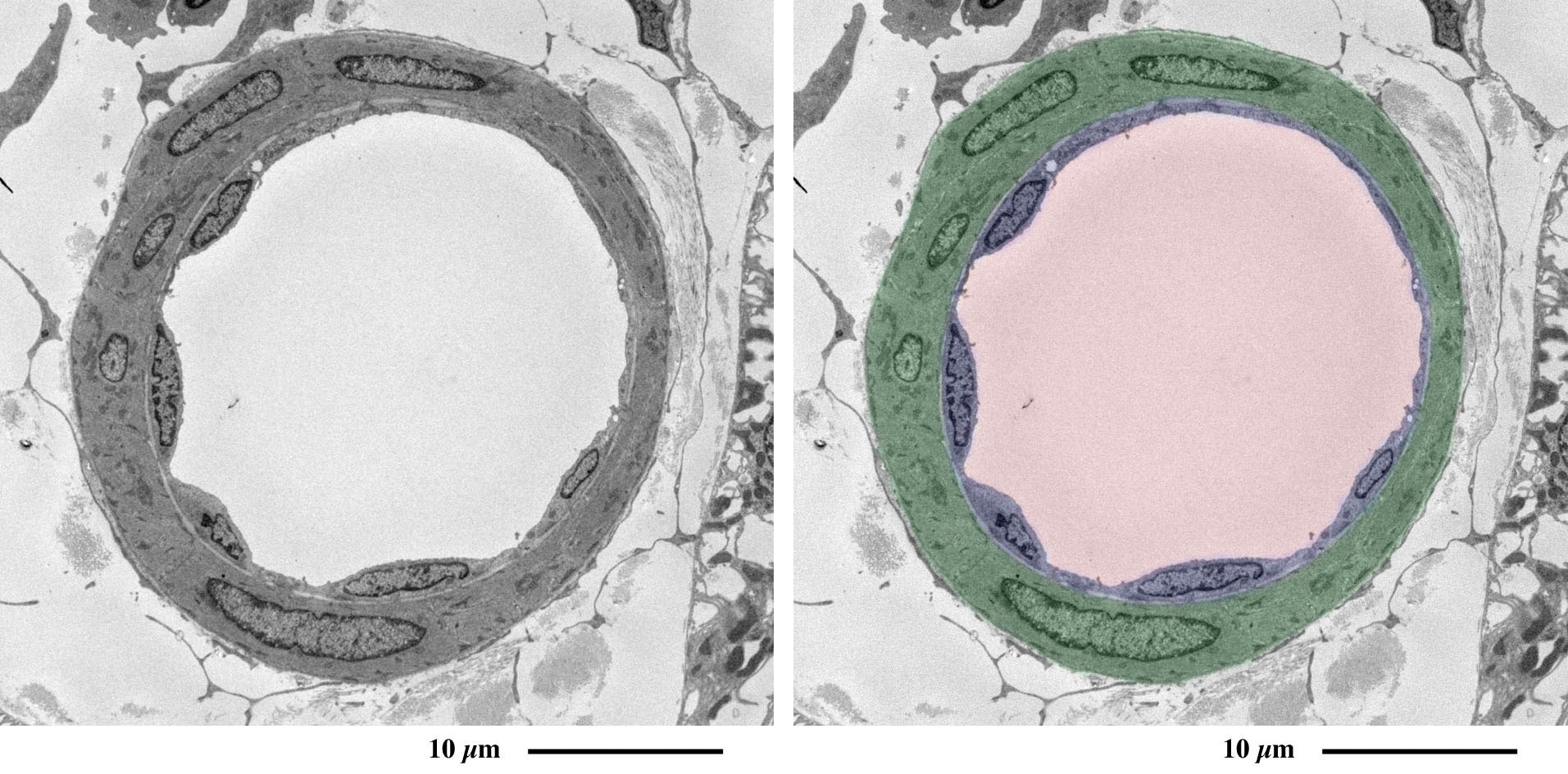 赤:血管内腔、青:血管内皮細胞、緑:平滑筋細胞