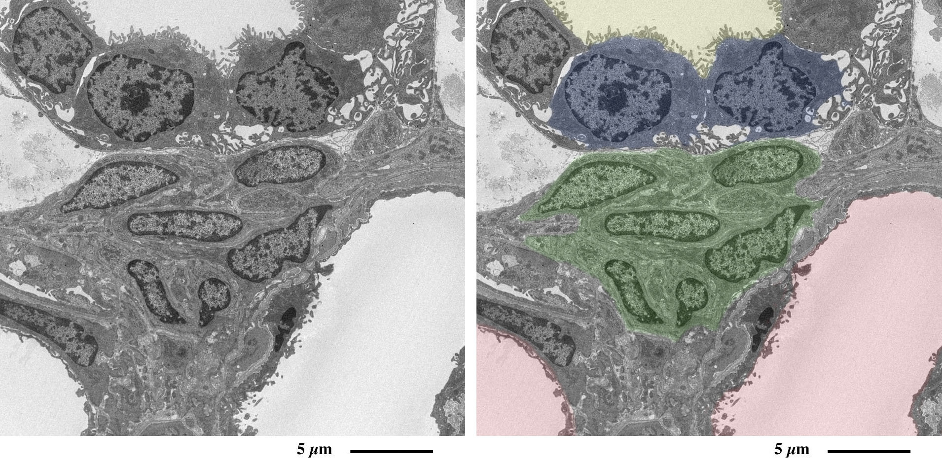 赤:毛細血管と血管内皮細胞、黄:血小板、緑:ボウマン腔と足細胞