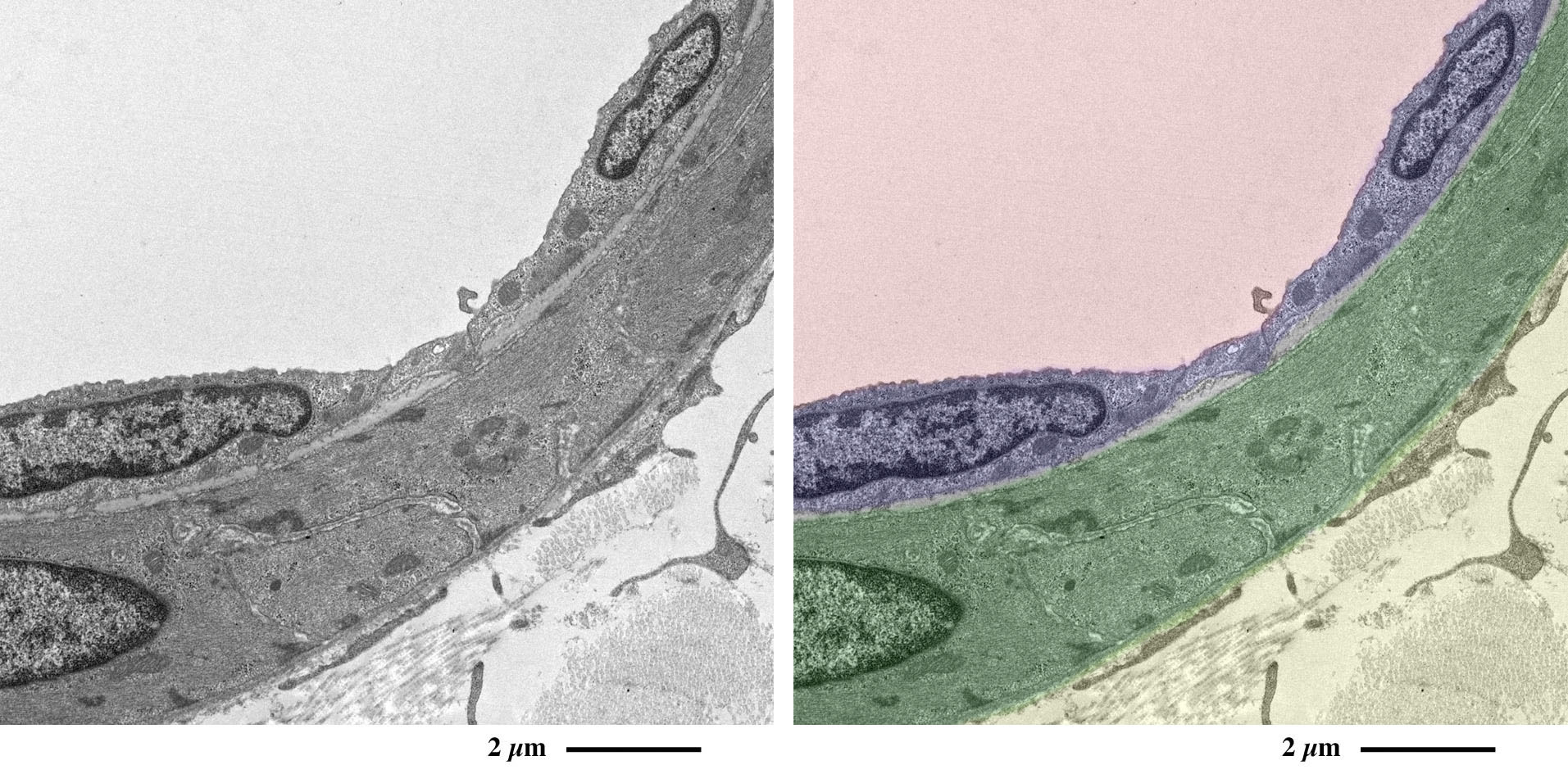 赤:血管内腔、青:血管内皮細胞、緑:平滑筋細胞、黄:血管外結合組織