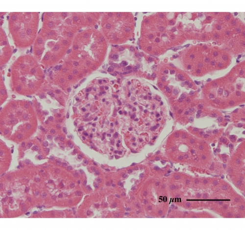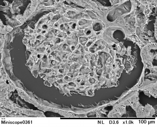 糸球体と呼ばれる球状の毛細血管(写真中央)を、袋状の上皮が取り囲んでいます。