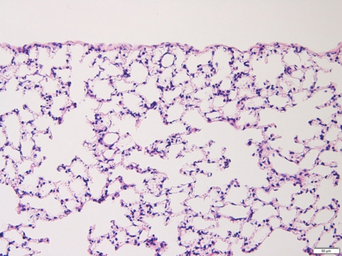 肺胞が位置し、毛細血管内には酸素を受けとる赤血球が見受けられます。