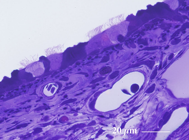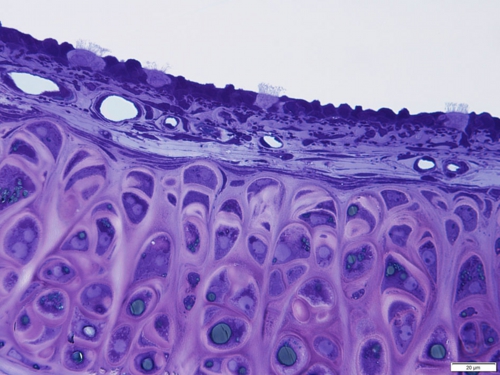 気管には粒子状物質の排除に関与する線毛細胞 ciliated cell が観察されます。