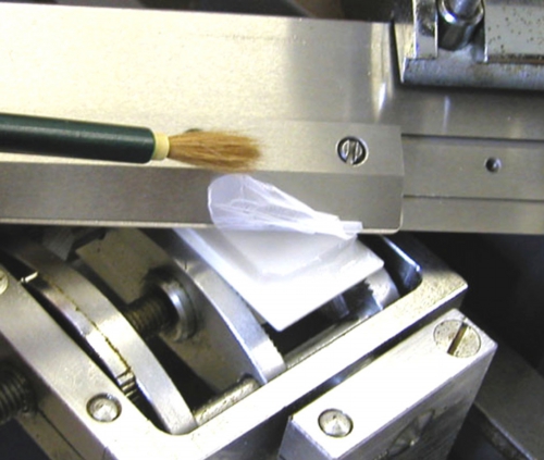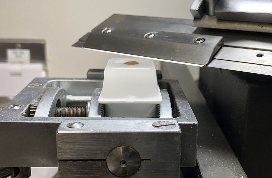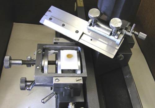 次にナイフの位置を変え、切り出されてくる切片の厚さを15, 20, 25, 30ミクロンのいずれかに調整して、慎重に薄切します。