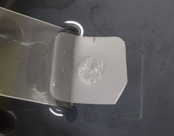 薄切された切片をピンセットでつまみ取り、約37℃の温水に切片を浮かせて伸展させた後、スライドガラス(武藤化学:NewシランII コーティングガラスを推奨)に接着させます。