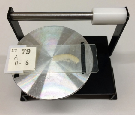 切片を載せたスライドガラスを導電テープで試料ホルダーに接着します。