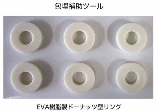 これは片面に接着シールが貼付されたスポンジ状のリングで、孔の内径と樹脂包埋カプセルの外径が丁度、8 mmでピッタリはまりますので、予め樹脂包埋カプセルに装着したところへ樹脂を流し込みます。