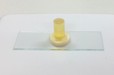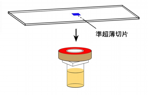 次に準超薄切片を樹脂包埋カプセル側にして、準超薄切片が樹脂包埋カプセルの中心に位置するように合わせてスライドガラスを接着させます。