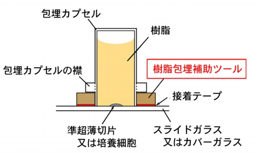 従来、再包埋する際に樹脂包埋カプセルとスライドガラスの間から重合・硬化前の樹脂が漏出してしまったり、樹脂包埋カプセルが移動して切片とは異なる位置で硬化してしまうトラブル発生が少なくありませんでした。