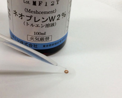 次に、グリッドに支持膜が付着し易くなるよう濾紙の上でネオプレンW2%溶液を滴下、乾燥させる前処置を加えておきます。