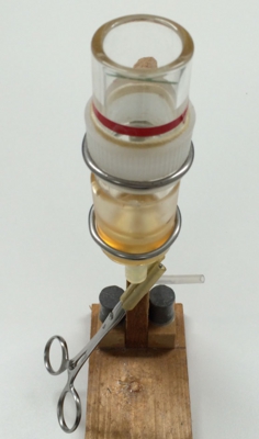 排出口の先にフォルムバール溶液のビンをセットした状態でクリップを外し、シリンダー内のフォルムバール溶液を排出させます。