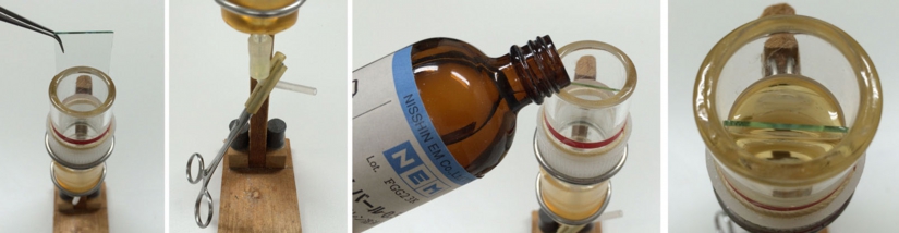 スライドガラスを支持膜作製装置のシリンダー部に挿入し、排出口をクリップした状態でフォルムバール溶液を注入します。スライドガラスの上端から約1 cm下まで充填した後、スライドガラスを軽く揺すり、スライドガラス面に付着した泡を浮かび上がらせます(泡が付着した状態では支持膜に孔が形成されます)。
