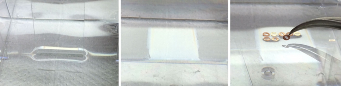 グリッドを並べ終わった後、支持膜の幅より少し大きめにカットしたパラフィルのカバー紙面側を、支持膜の一方から静かに載せるように付着させます。パラフィルムに支持膜の全面が付着したところで、そっと水面から引き上げ、余分な水滴をブロワーで軽く吹き飛ばします(強く吹き飛ばすとパラフィルムから支持膜が剥がれてしまうので注意)。