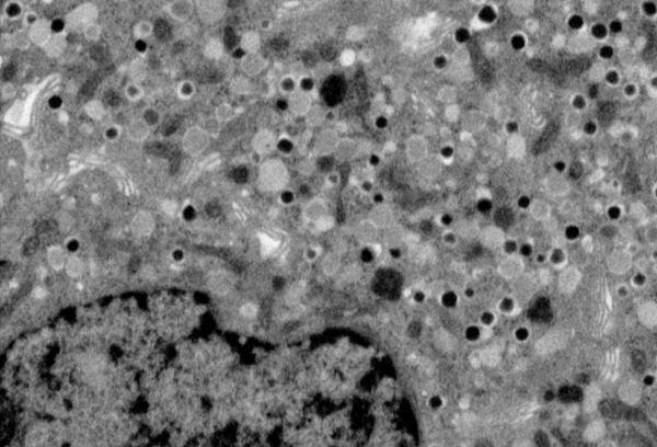 透過型電子顕微鏡では、細胞や組織を薄くスライスした切片に電子線を透過させて、内部構造を断面として高解像度で捉えます。