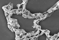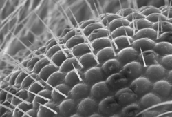 走査型電子顕微鏡では、金属でコーティングされた細胞や組織の表面を電子線で走査して表面形態を立体的に捉えます。
