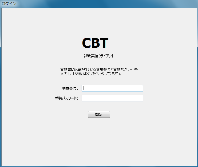 CBTは、従来の紙と鉛筆で行っていた多肢選択問題をコンピュータ画面上で正答肢をクリックするという新しい試験形式です。試験時間60分のブロックが全部で7つ用意されています。ブロック1から4ではそれぞれ 60 問の五肢択一問題が出題されます。ブロック5とブロック6は特殊な形式を採用しています(「CBTチュートリアル」後半でその例題を提示します)。ブロック5は多選択肢問題で、ブロック6では、解答しないと先に進めず(強制的に進めることは可能)、さらに先に進むと前に解答した問題には戻れない仕組みです。ブロック1からブロック5では解答後に問題の見直しができますが、ブロック6では問題の見直しができないことに注意してください。ブロック7はアンケートです。 ここに示しているのは学生が受験のためにコンピュータの席についたときの画面です。 試験会場で配布された受験票に「受験番号」と「受験パスワード」が印刷されていますので、自分の受験票に示された「受験番号」と「受験パスワード」をキーボード入力し、画面下部の「開始」をクリックします。「CBTチュートリアル」ではキーボード入力は行なえませんので、「開始」または上部右端の「次へ」をクリックしてください。 |