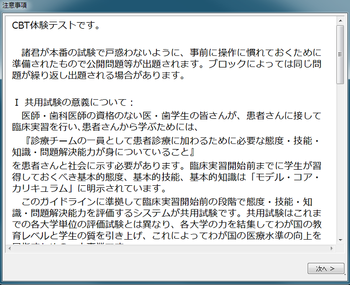 次に注意事項画面が表示されます。注意事項では、共用試験の意義、出題される問題形式、ブロックの情報などが表示されます。上記に表示されているのは体験テストの注意事項の一部です。