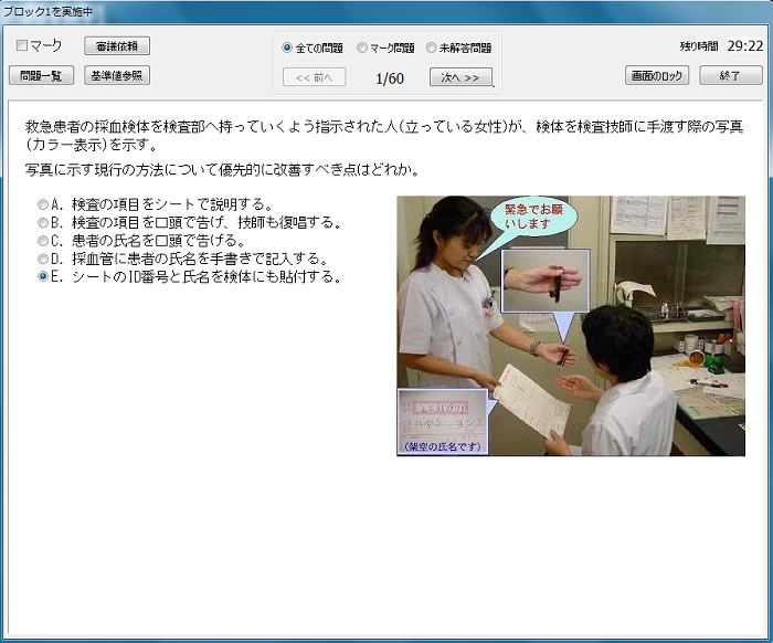 E を選択すると、画面のように選択肢 E の左側の○の中に青いマークがつきます。この問題画面上部中央の「次へ >>」ボタンをクリックすると次の問題が表示されます。