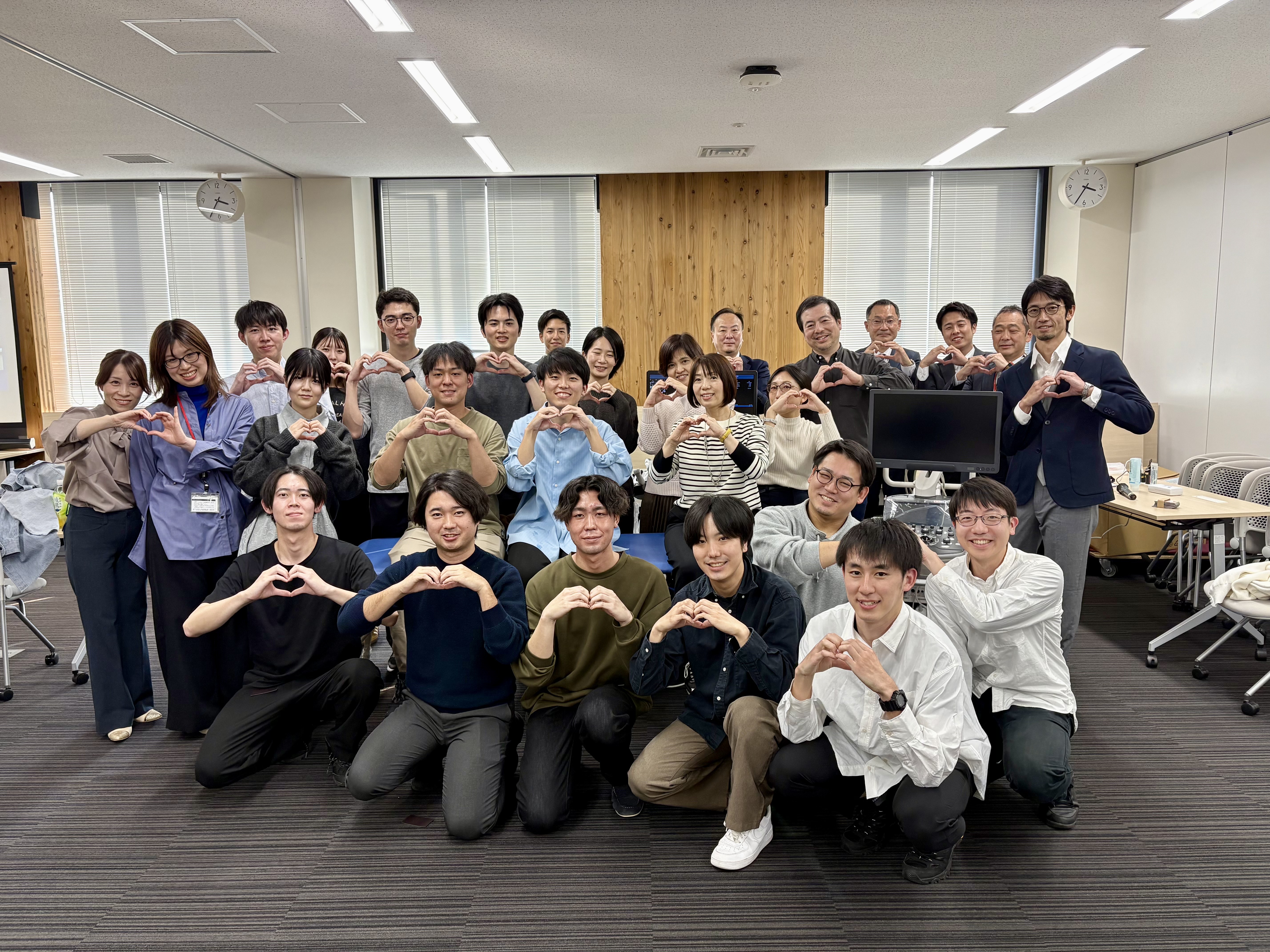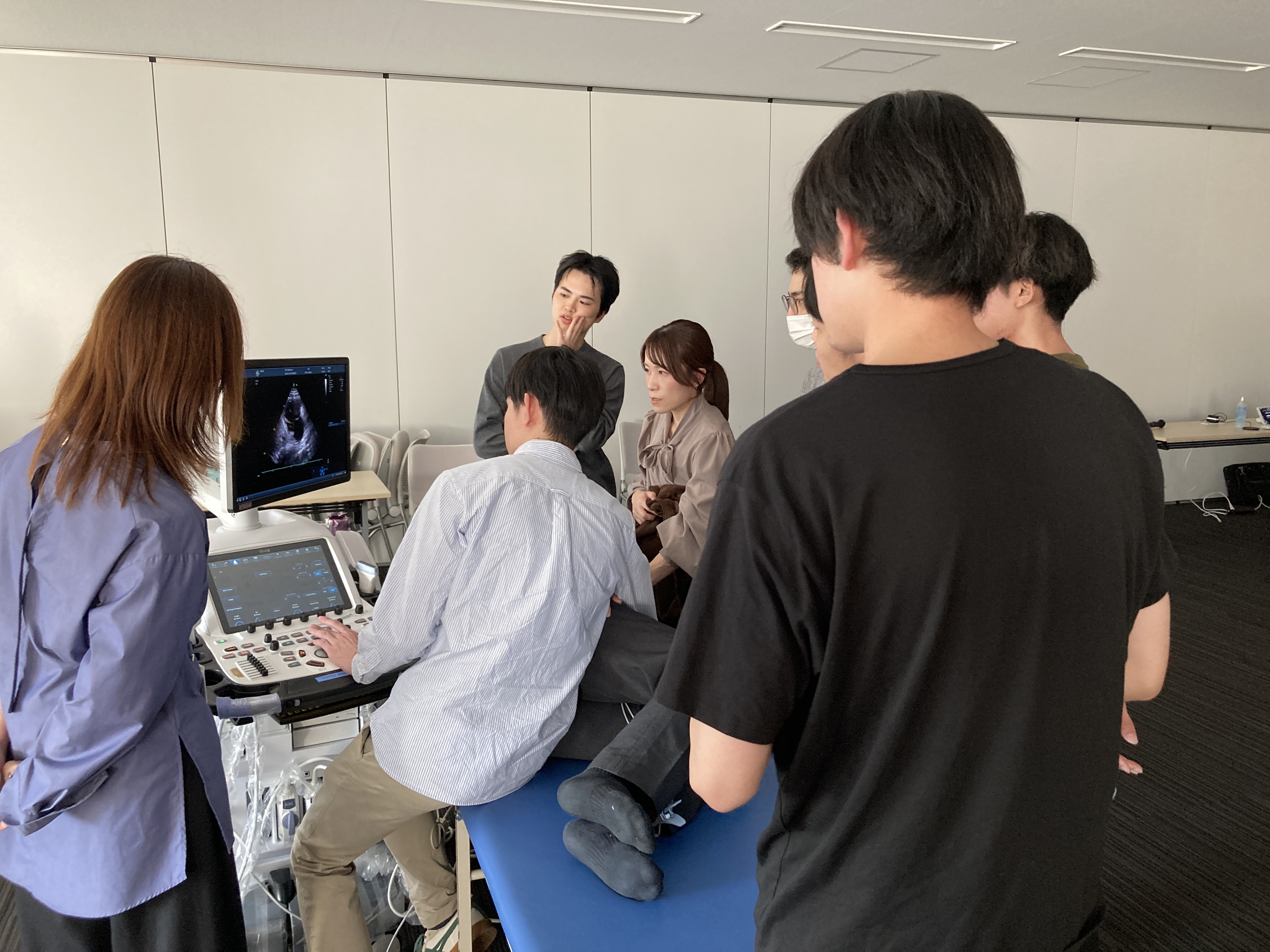 遠くは高千穂・椎葉・美郷町など県内各地で研鑽を積まれている先生方と多くの研修医の先生方が参加され、皆さんにプローブを握ってもらい、心エコー専門技師と共に直接心エコー図検査を実践してもらう事が出来ました。高機能ハイエンド機器と最新ポータブル機器それぞれの装置の特徴と臨床での活用法も体験していただき、質問も沢山でて時間延長して熱量の高い、賑やかな時間でした。宮崎大学附属病院循環器内科の医師と実際の疾患に出会ったときのスクリーニングとその後の診断や治療についてもざっくばらんなお話しもできて、とても有意義な時間でした。