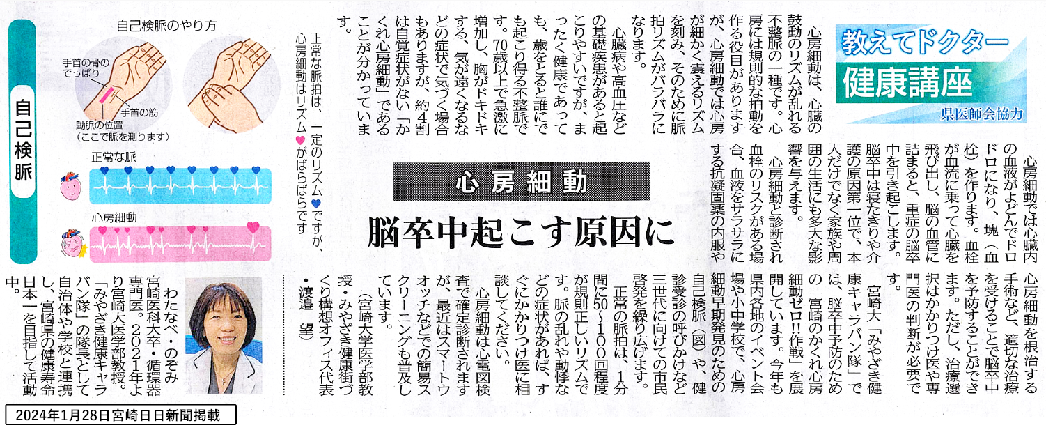 2025年10月3日(金)渡邉望教授が青葉地区で「知っておきたい心臓病のお話」をテーマに講演を行いました。 みやざき健康キャラバン隊の隊長も務める渡邉教授は、みやざきの「かくれ心房細動ゼロ‼」作戦にも力を入れており、心臓のしくみ、不整脈に気づいたら早めに医療機関を受診することの重要性や、歩くことが心臓病・脳卒中予防に繋がることなどをお話ししました。 講演後は心電図モニターチェックも実施。皆さん健康意識が高く、熱心に聞いておられ先生や技師の皆さんとも普段の健康状態についてもたくさん相談されていました。 青葉地区の皆さん、ありがとうございました!