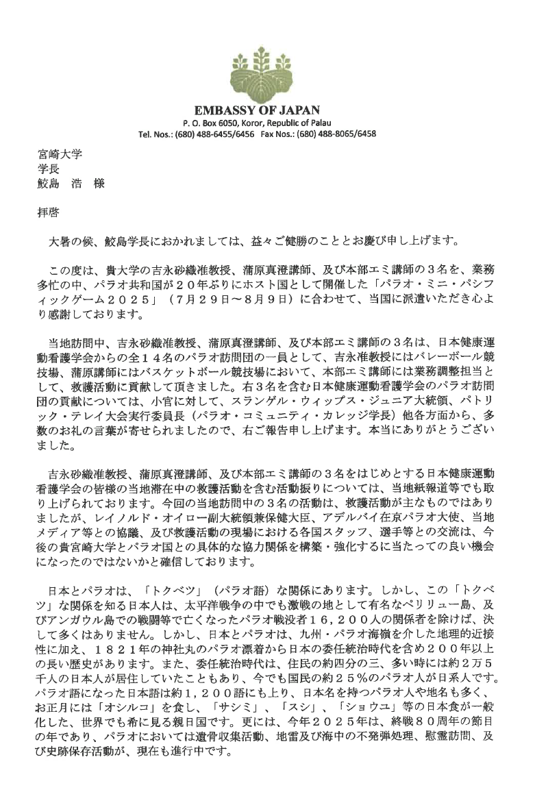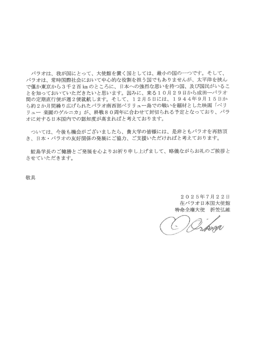 活動に対し、在パラオ日本大使館 特命全権大使 折笠弘維様より感謝状をいただきました!