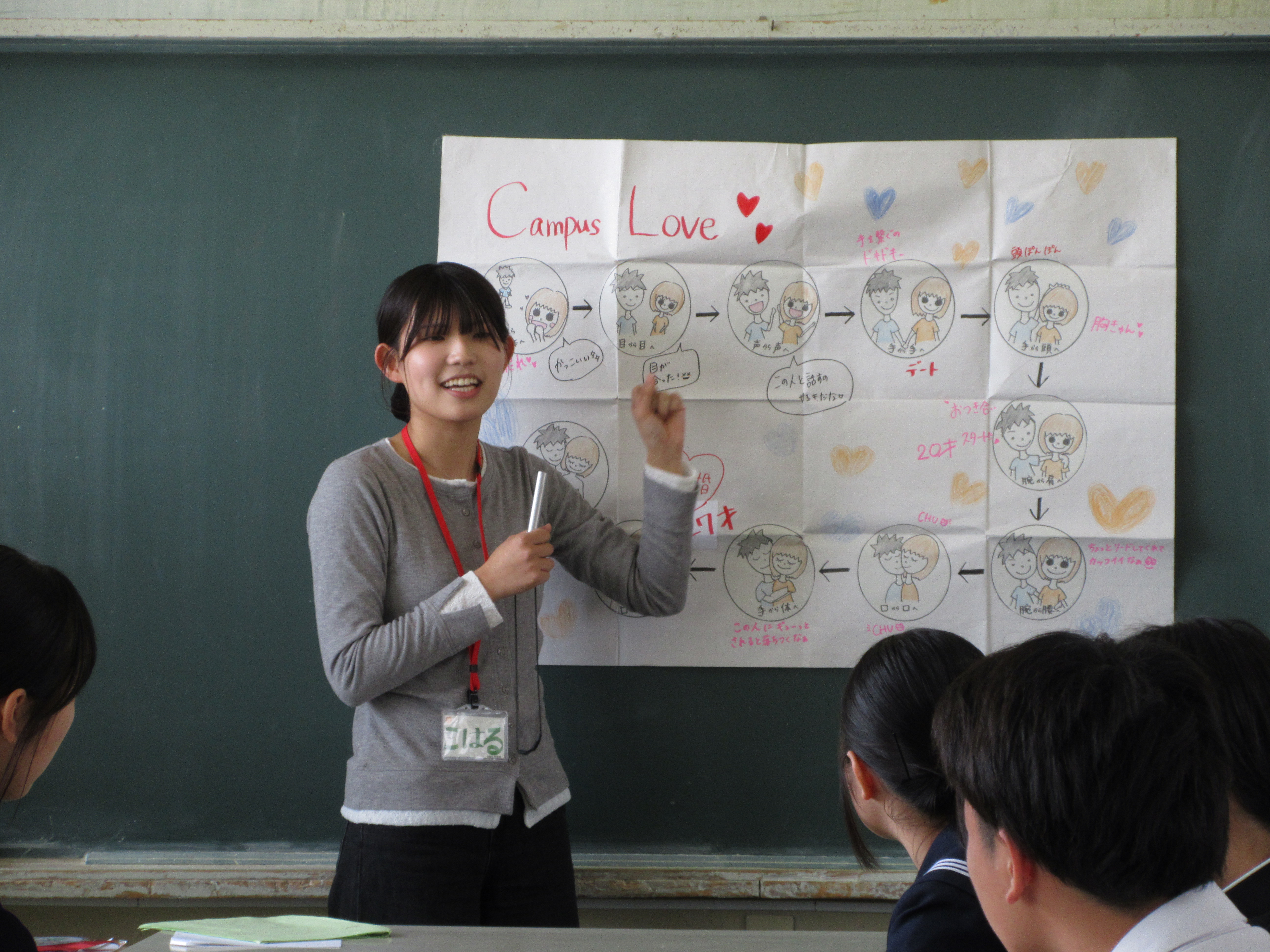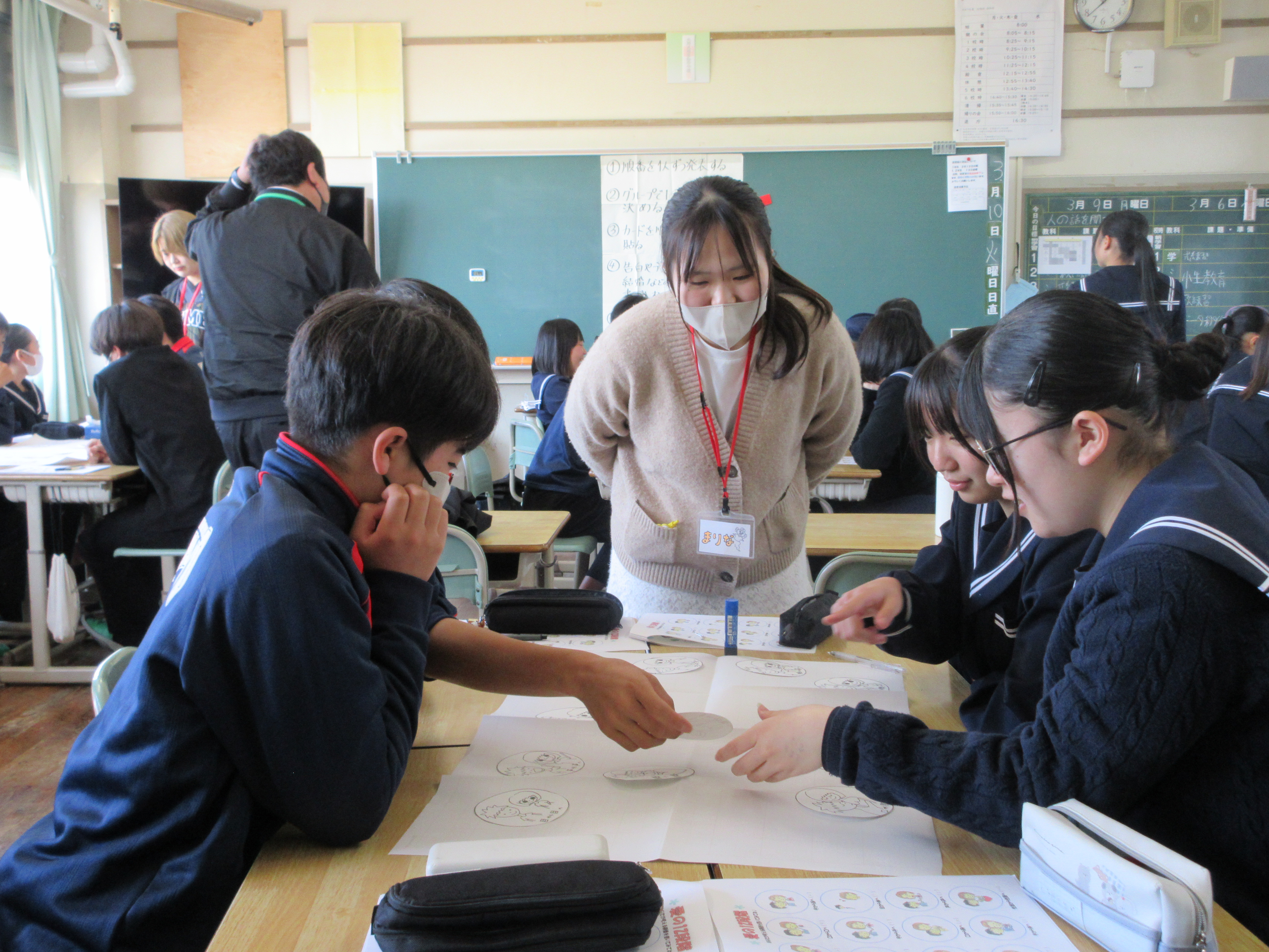 本学では、性に関する課題解決のみならず、生命の尊さや、相手を思いやることの大切さ、良好な人間関係を形成することなど、若者の「生きる力」を育むことを目的に、大学生が同年代を生きる仲間として、中高生を対象に性教育を実施しています。中学生と大学生が、リラックスした雰囲気の中で、講座を実施することができました。