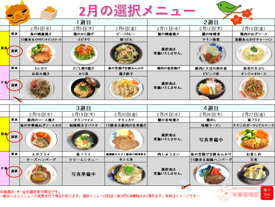 *選択食をお選びいただきますと別途1食70円(消費税込み)を頂きますので予めご了承ください。