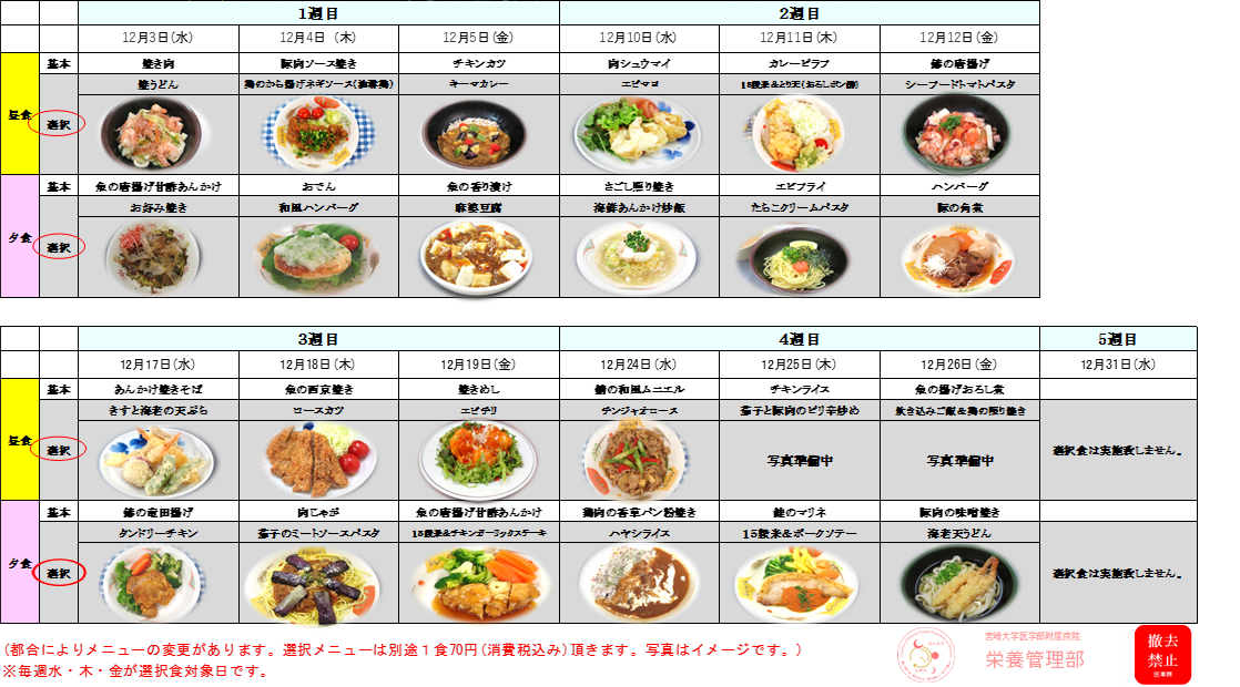 週3日(水・木・金曜日)の昼食と夕食は、常食の患者様を対象に選択メニューを実施しています。