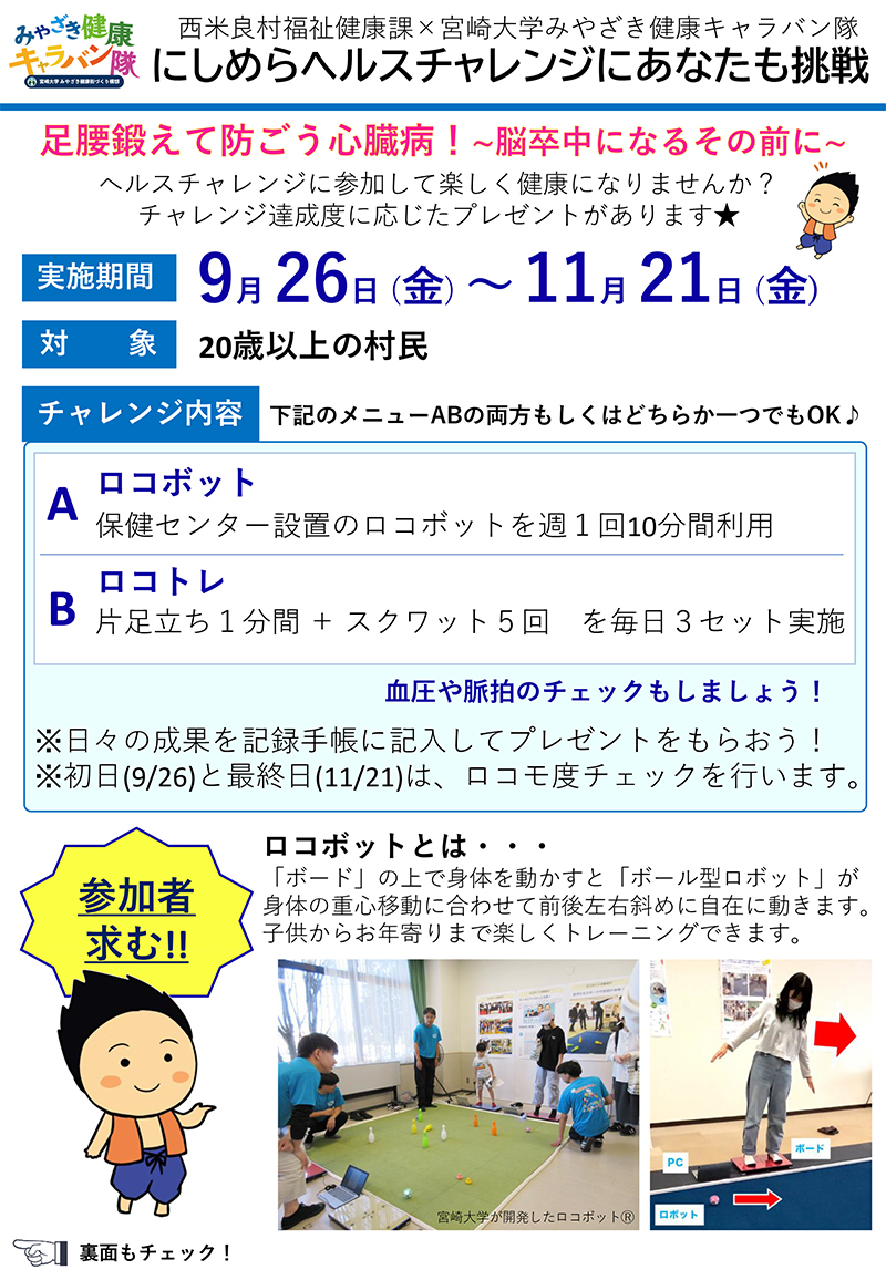 2025年9月26日(金)に西米良村福祉健康課とみやざき健康キャラバン隊の共同企画「にしめらヘルスチャレンジ」を開始しました。