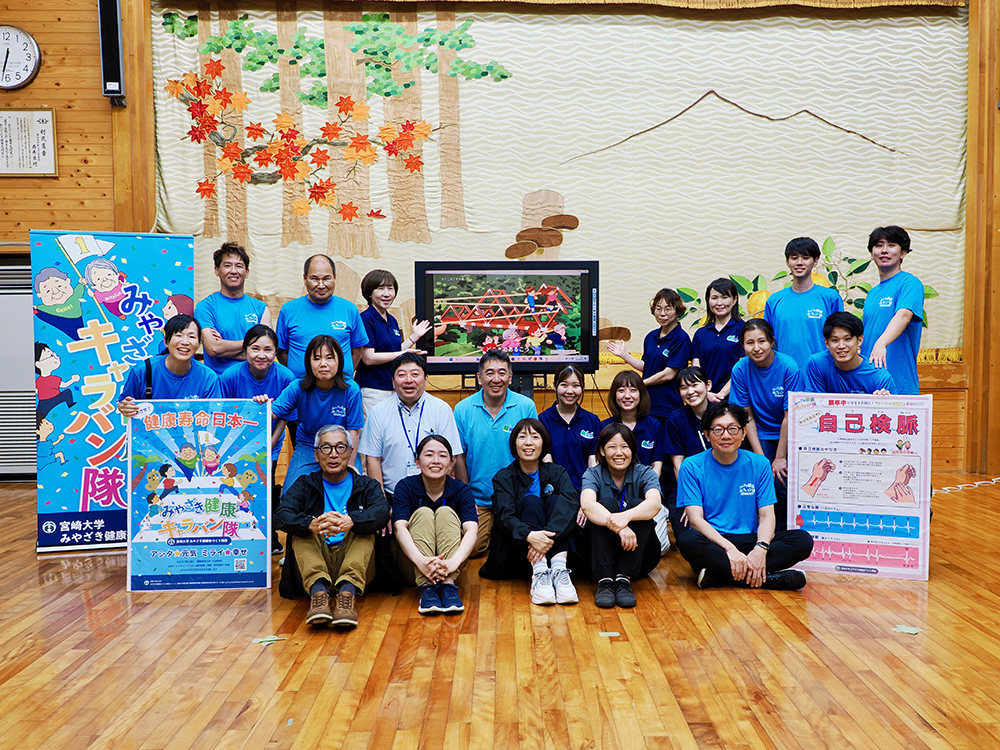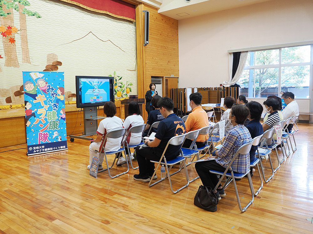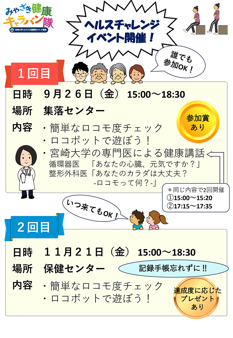 今回の「にしめらヘルスチャレンジ」では、「足腰鍛えて防ごう心臓病!~脳卒中になるその前に~」をテーマに、宮崎大学のキャラバン隊・隊長であり医学部循環動態生理学分野の渡邉望教授(心臓)、医学部整形外科分野の田島卓也准教授(ロコモ)、工学部機械知能工学プログラムの山子剛教授(ロコボット)が中心となって企画しました。