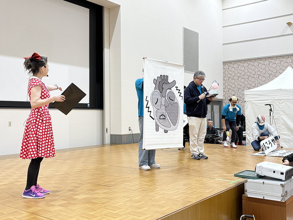 マッチョ体操の後は「心リハ♡みやざき」によるステージパフォーマンスが開始。江南病院の渡邊玲子先生率いる「心リハ♡みやざき」は音楽や劇を通して心臓病の予防・治療、心肺蘇生などの周知活動を行っています。歌と踊りを効果的に使って会場の皆さんも参加できるクイズ大会も行われました。キャラバン隊が進める「あるこうや」のダンスも披露いただきました!歌と踊りで楽しく心臓病のことを学ぶことができたのではないでしょうか。「マッチョ体操」のお二人、「心リハ♡みやざき」の皆さん、ありがとうございました!